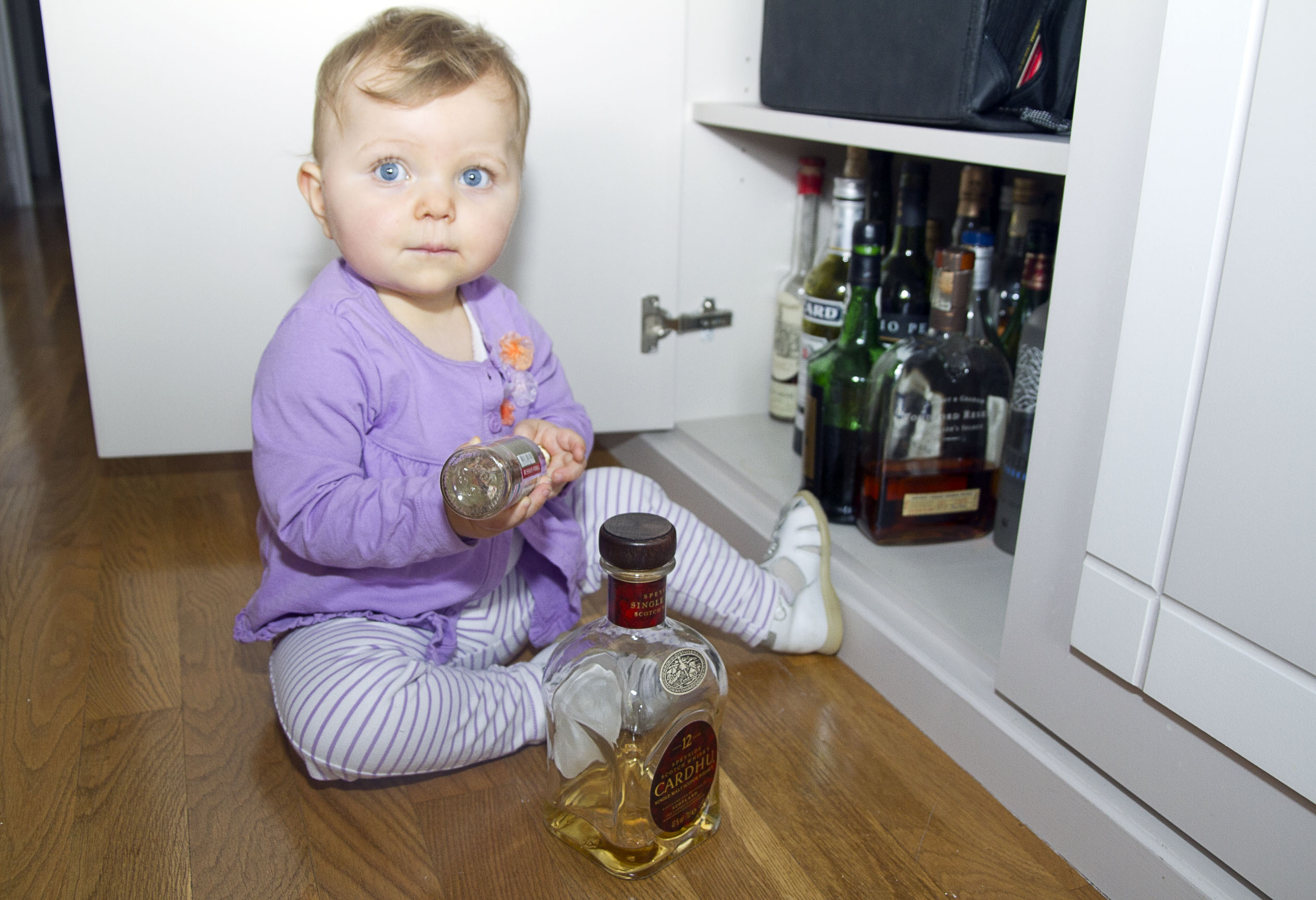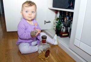 Last night I made a batch of margaritas for a friend’s birthday party. Ella curiously followed me around (via her butt-bump. She refuses to crawl) as I gathered the ingredients. While mixing the concoction, Ella gave me with a look of understanding and scooted her way out of the kitchen. A few seconds later I heard clinking glass and came into the den to find this. Noticed how she pulled out the good stuff first, but grabbed a smaller bottle that she could stash in her diaper.