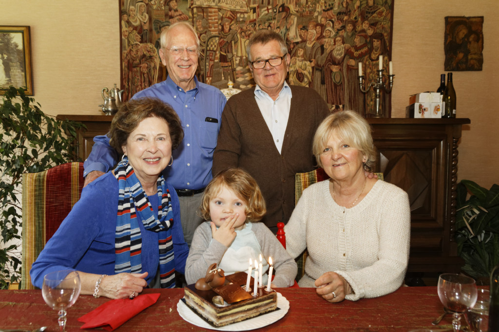 Mamie & Papy, and (special guests) Gran & Grandad enjoy the birthday festivities as Ella ponders if there will be more presents.